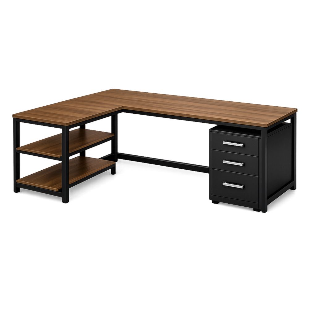 Scrivania angolare in legno e metallo con cassetti e ripiani