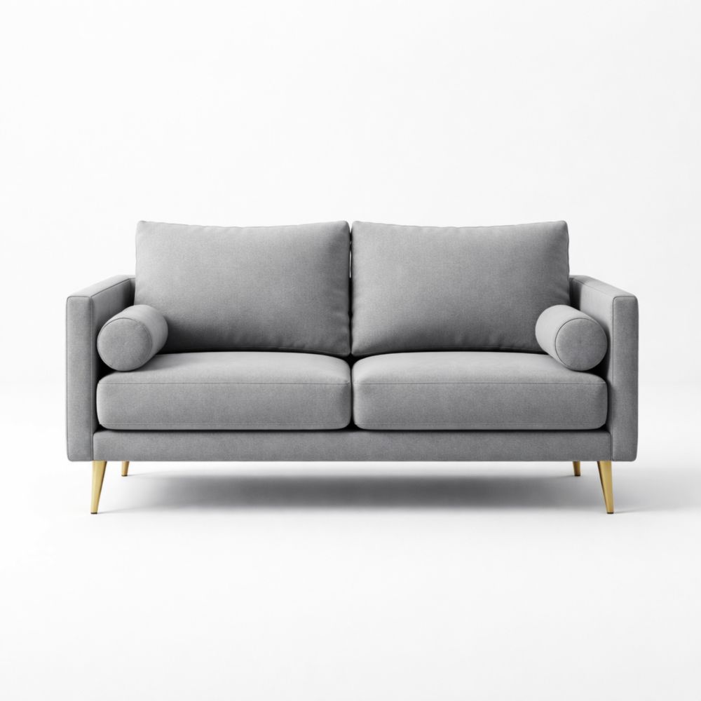 Divano a Due Posti in Tessuto Grigio con Gambe in Metallo Dorato