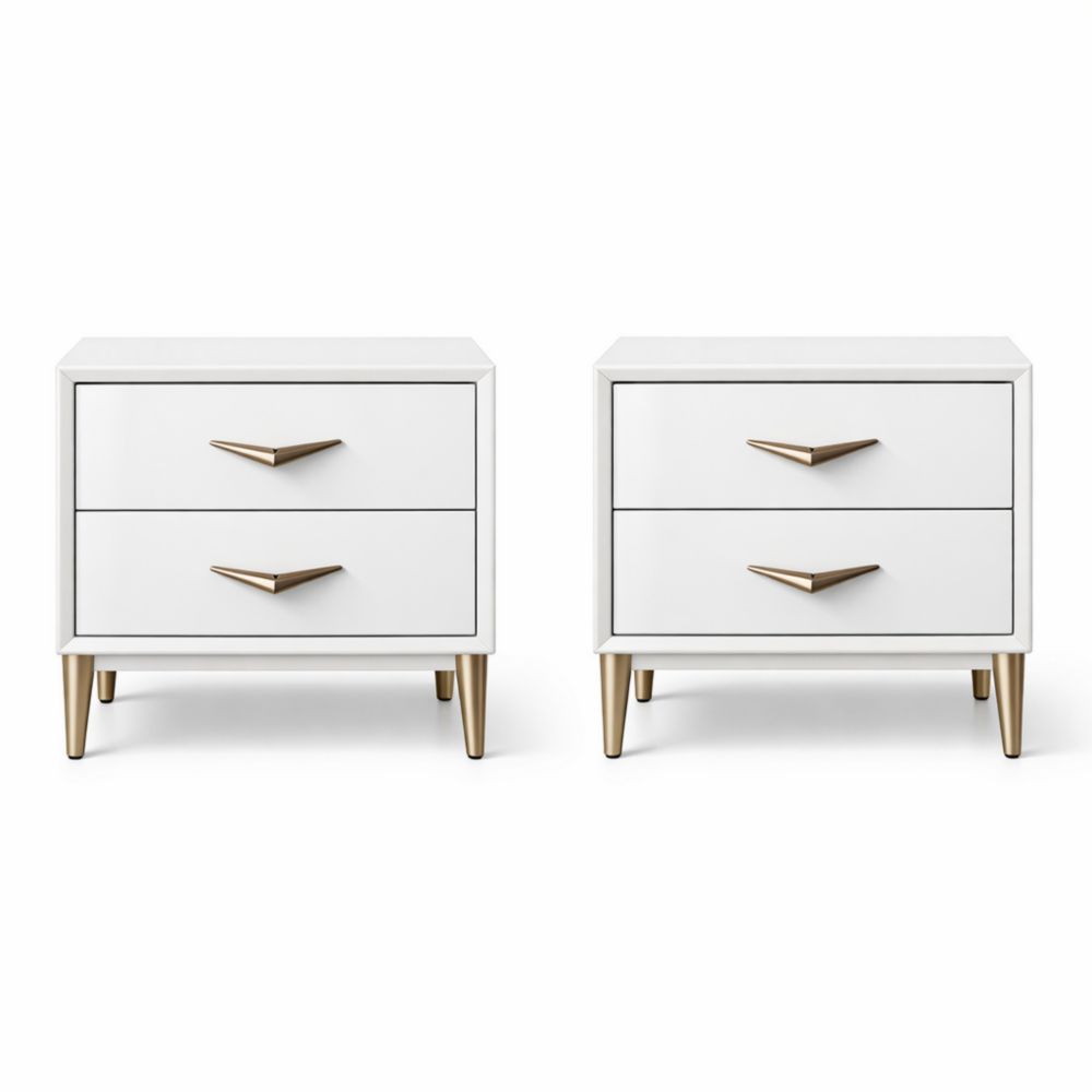 Set di 2 Comodini con 2 Cassetti in Legno Bianco e Gambe in Metallo Dorato