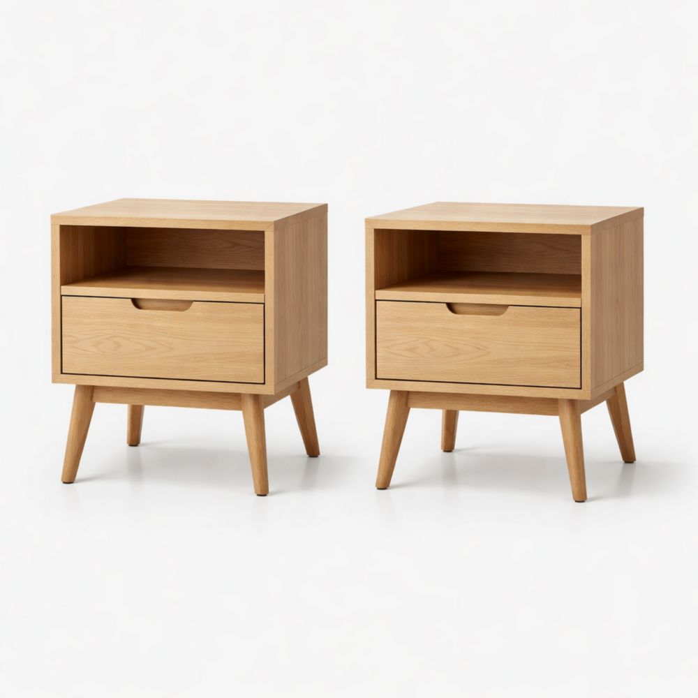 Set di 2 Comodini in Legno di Rovere con Cassetto e Ripiano