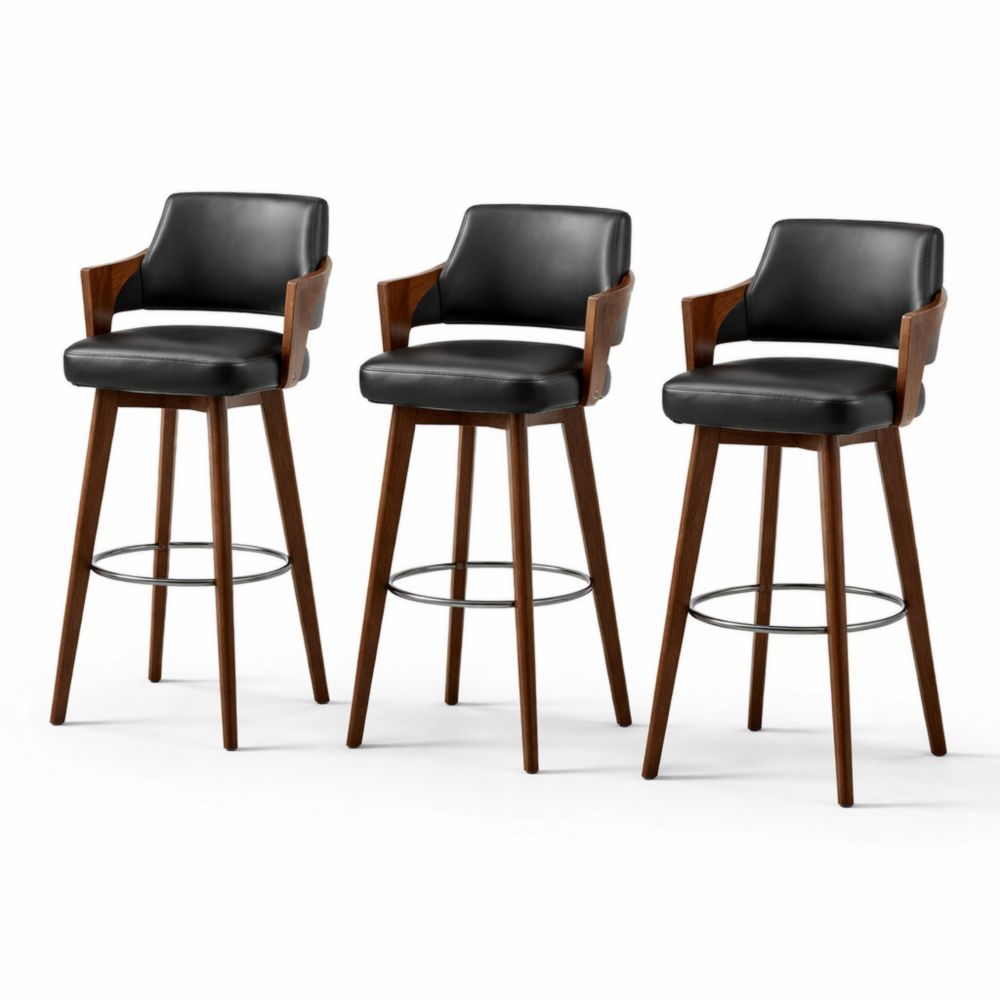 Set di 3 Sgabelli Bar Girevoli in Pelle Nera e Legno